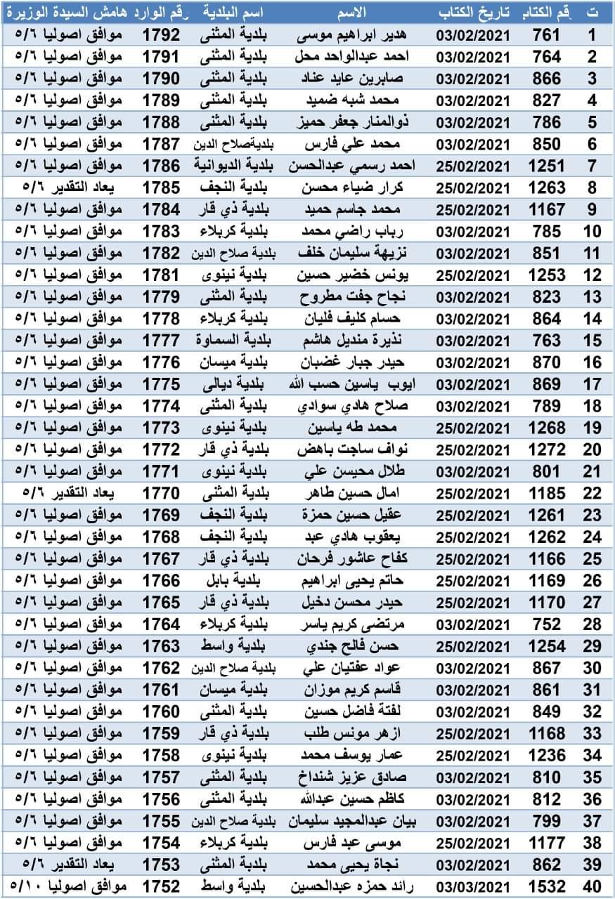 وزارة البلدية التابعة الى وزارة الأعمار والإسكان تعلن عن اسماء المشمولين في قطع الاراضي اسماء المتقدمين في مقر الوزارة لشراء قطع اراضي ليوم 1 -2 -2021 وفق المادة 25/ ثالثاً من قانون 21 لسنة 2013 لبيع وايجار اموال الدولة، بعد الموافقة الاولية لوزارة البلدية التابعة الى وزارة الاعمار والاسكان والبلديات العامة المهندسة نازنين محمد وسو على معاملاته، علماً بانه سيتم لاحقا تصديق المعاملات كافة اسماء المشمولين إذا كانت مستوفية للشروط القانونية.