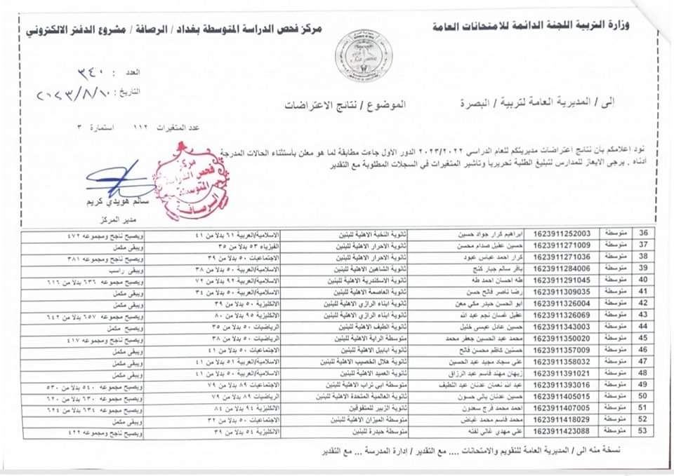 مديرية تربية البصرة جاءت جميع نتائج اعتراضات الصف الثالث متوسط 2023 متطابقة ماعدى الاسماء المدرجه اسفل.