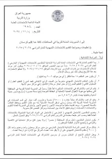 - يُسمح للراغبين في الإشتراك من مواليد (٢٠٠٦ وما قبلها) التقديم على الدراسة الابتدائية على ان يكون المتقدم متخرجا من الصف الرابع الابتدائي كحد أدنى للتعليم العام أوالمستوى الثاني (التعليم المسرع) او ممن اجتازوا مرحلة التكميل في مراكز محو الأمية ويؤهل المتقدم في حال النجاح او الاكمال بدرس او درسين لتأدية الامتحانات العامة النهائية، فيما يُقبل المتقدم لأداء الامتحانات التمهيدية للدراسة المتوسطة بعد مُضي ثلاث سنوات دراسية او اكثر على إنهائه المرحلة الابتدائية لمن كان دون(٢٨) عاما اما من اكمل (٢٨) فما فوق بإمكانه اداء الامتحانات مباشرة دون سنوات الانتظار اعلاه وكذلك الحال للراغبين بالاشتراك لاداء امتحانات الدراسة الإعدادية شرط اجتياز المتقدم المرحلة المتوسطة او ما يعادلها بنجاح.